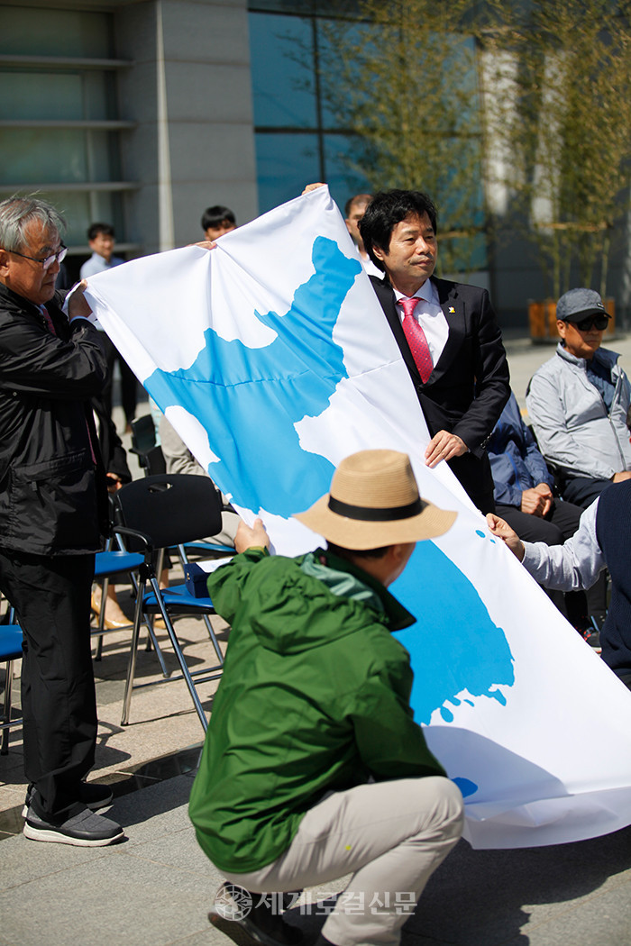 이날 게양된 한반도기는 역사적인 남북정상회담에 이어 북미정상회담이 성공적으로 마무리될 때까지 도교육청 앞에 태극기, 전북교육청기와 함께 펄럭이게 된다.
