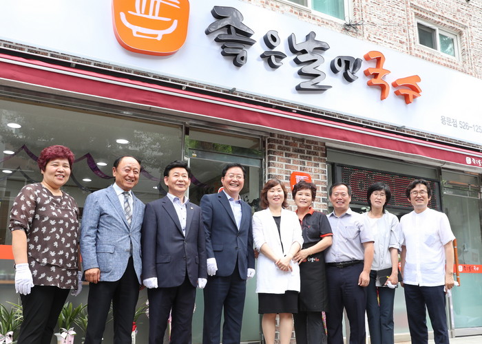 | ▲11일 개소한 ‘좋은 날엔 국수’ 매장 앞에서 장종태 대전 서구청장(왼쪽 네번째)을 비롯해 관계자들이 기념촬영하고 있다.<사진제공=대전 서구청> |