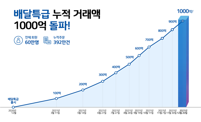 배달특급은 서비스 개시 3개월 만에 누적 거래액 100억 원을 돌파한 뒤 올해 ▲5월 14일 200억 원 ▲6월 27일 300억 원 ▲7월 27일 400억 원 ▲8월 26일 500억 원 ▲9월 19일 600억 원 ▲10월 11일 700억 원 ▲11월 7일 800억 원 ▲11월 30일 900억 원 발판을 밟으며 상승 곡선을 그려왔다.