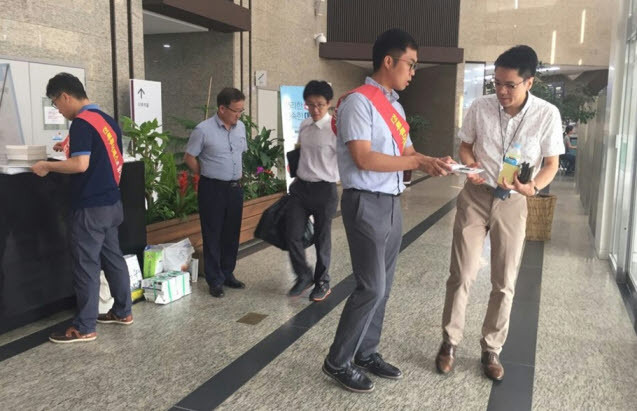 | ▲ 김제시 직원들이 21일 정부세종청사에서 출근하는 공무원들에게 관광객 유치 홍보활동을 벌이고 있다.<사진제공=김제시청> |