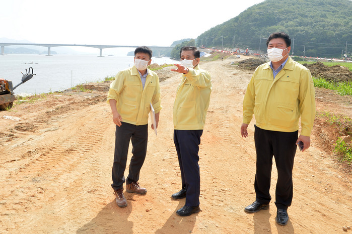| ▲ 유천호(가운데) 강화군수가 지난 해 8월 삼산면 도로건설 현장에서 진행 상황을 점검하고 있다. |