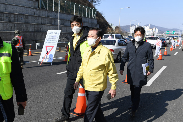 | ▲ 유천호(가운데) 강화군수가 지난해 3월 코로나19로 강화대교와 초지대교에서 발열검사 요원 등을 격려하고 있다. |