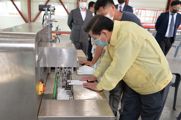 ▲ 유천호(맨앞) 강화군수가 지난해 강화산단 내 마스크공장 입주기업 현장을 방문 하고 있다. |