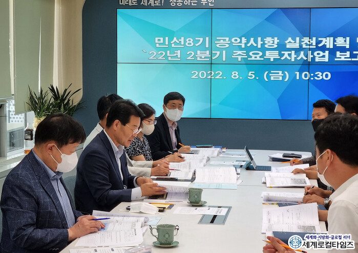 8일 부안군에 따르면 지난 4일부터 5일까지 2일간 민선8기 공약사업 실천계획 및 2022년 2분기 주요투자사업 보고회가 개최된 가운데 부서별로 민선 8기 공약사항에 대한 성실한 이행을 위해 각각의 공약별 소요예산, 추진기간, 세부 추진계획 등을 점검하고 토론했다.