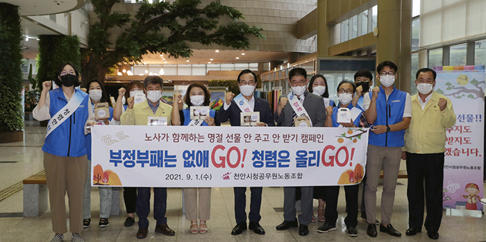캠페인에 동참한 박상돈 시장은 “진정되지 않고 있는 코로나19 확산을 차단 위해 전 직원과 시민 스스로 방역지침을 철저히 준수해야한다”고 강조하고, “명절을 맞아 공정하고 투명한 업무처리를 통해 청렴도 제고를 위해 노사가 함께 노력해 나가자”고 말했다.