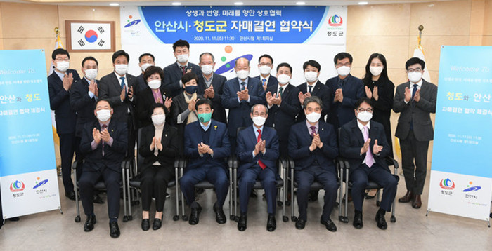 11일 안산시청에서 열린 협약식에는 윤화섭 안산시장과 박은경 안산시의장·이승율 청도군수·김수태 청도군의회 의장 등 관계자가 참석해 상호협력에 적극 노력하기로 뜻을 모았다.