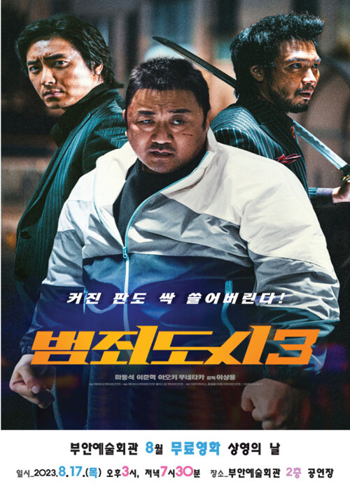 14일 부안군에 따르면 오는 17일 오후 3시와 오후 7시 30분, 하루 2회에 걸쳐 부안예술회관에서 ‘범죄도시 3’가 무료 상영된다. 만 15세 이상 선착순 입장이며 공연장이 만석일 경우 입장이 제한될 수 있다.
