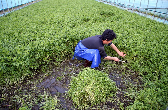 | ▲ 경남 하동군 횡천면 남산리 주민이 비닐하우스에서 깨끗한 미나리를 수확하고 있다. <사진제공=하동군청> |