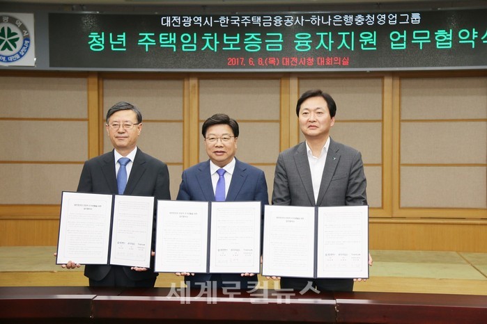 대전시는 8일 시청 대회의실에서 한국주택금융공사, 하나은행 충청영업그룹과 함께 ‘청년주택임차보증금 융자지원 업무협약’을 체결했다.