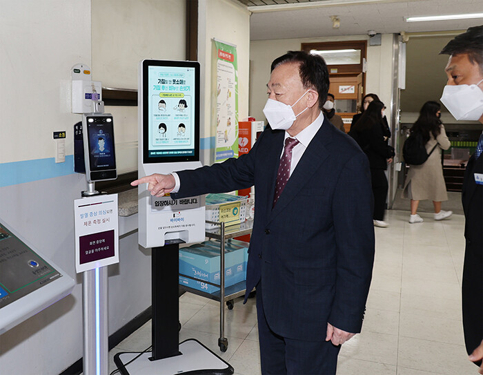 | ▲ 설동호 대전시교육감이 신학기 방역관리 현장 방문해 점검하고 있다. (사진=대전교육청) |