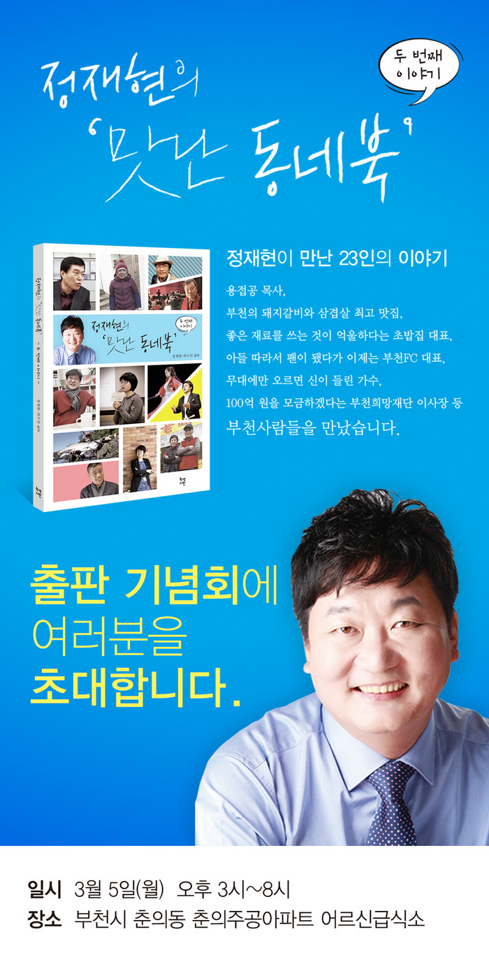 | ▲ 정재현 부천시의원이 다음달 5일 춘의동 어르신급식소에서 '정재현이 만난23인의 이야기' 출판기념회를 연다. |