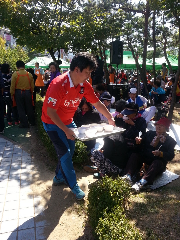 | ▲ 2014년 10월 정재현 부천시의원이 부천 송내남부역 향기네 무료급식소에서 어르신들에게 식사 제공 봉사를 하는 모습. |