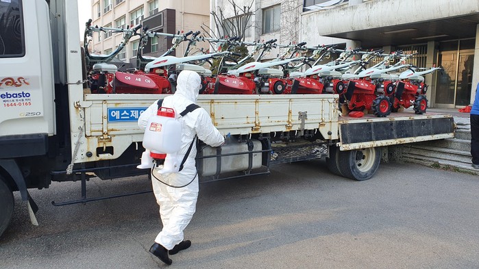 ▲ 옹진군에서 신규 구입한 농기계에 방역을 하고 있다. (사진=옹진군 제공)