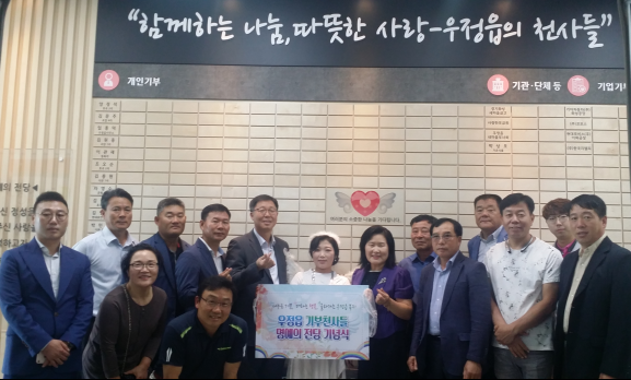 | ▲ 경기도 화성시 우정읍사무소 다목적실 벽면에 '기부천사 명예의 전당'을 조성하고 18일 기념식을 개최, 참석자들이 기념촬영을 하고 있다. |
