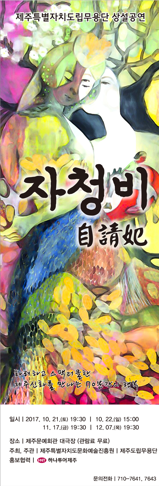 '자청비,自請妃'는 제주도를 대표하는 여신이자 농사의 풍흉을 다스리는 신에 대한 내용으로 원래는 인간 세상의 소녀였지만 씩씩하게 운명을 개척해 나간 자청비의 재치와 활약을 통해 능동적인 여인상을 그린 제주도립무용단 창작작품 공연이다.