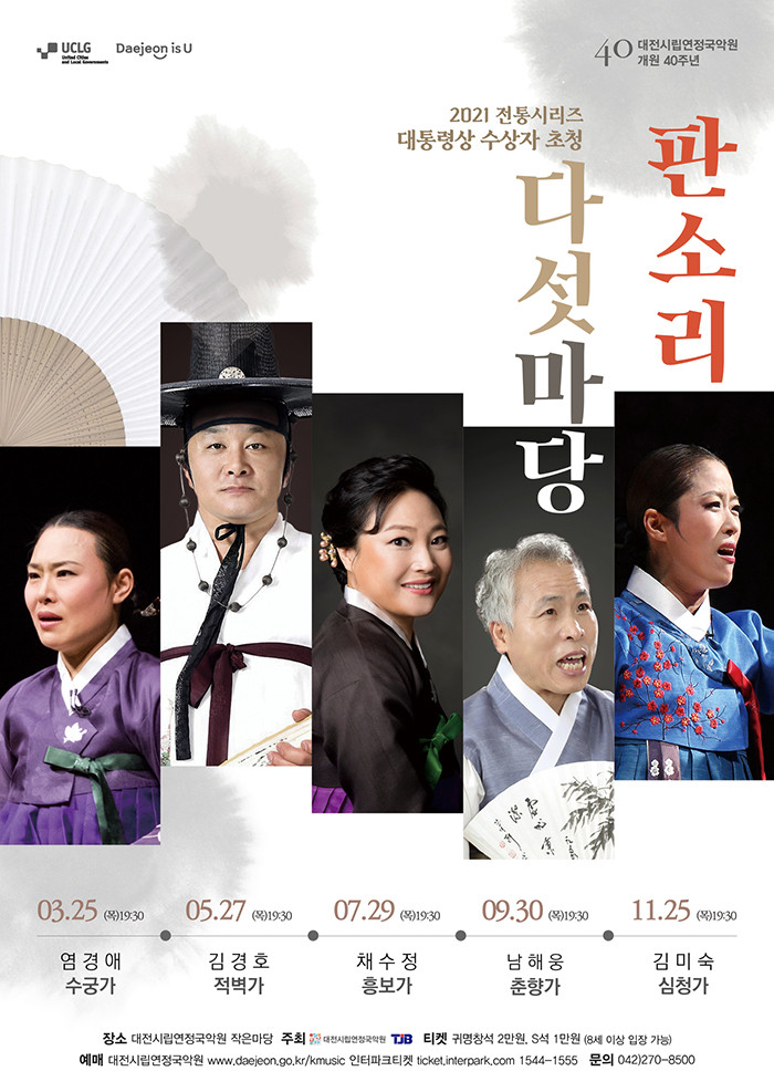 대전시립연정국악원 이영일 원장은 “대통령상 수상자 초청, 국내 대표 명창들이 펼치는 대한민국 5대 판소리의 감동과 전율의 무대를 통해 고품격 전통예술을 만끽 할 수 있는 공연”이라며 “코로나19로 지친 시민들에게 큰 위로가 되고 국악 대중화에도 기여 할 것”이라고 말했다.