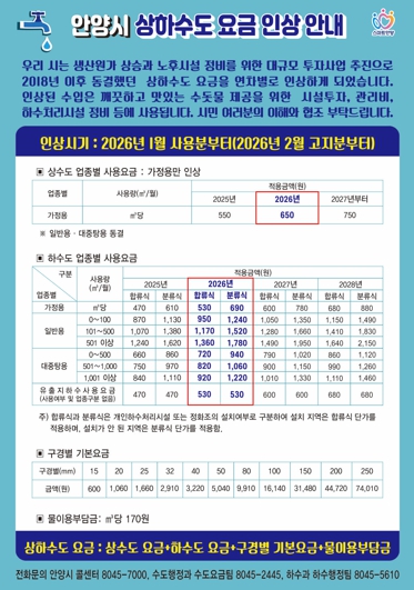 하수도 요금 역시 2024년부터 2028년까지 단계적 인상을 추진 중이다. 현재 안양시 하수도 요금 현실화율은 약 56.2% 수준에 머물러 있어, 경영 정상화를 위한 요금 조정이 불가피한 상황이다. 올해는 3단계 인상이 적용되는 해로 2026년 1월부터 가정용 하수도 요금은 합류식 지역의 경우 1톤(㎥)당 530원(60원 인상), 분류식 지역은 690원(80원 인상)으로 인상되며 일반용, 대중탕용, 유출지하수의 경우도 1톤(㎥)당 금액이 인상된다.