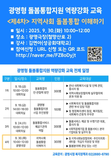교육 일정과 신청 방법은 홍보자료 내 큐알(QR)코드 또는 신청 링크로 확인할 수 있으며, 자세한 사항은 복지정책과로 문의하면 안내받을 수 있다.