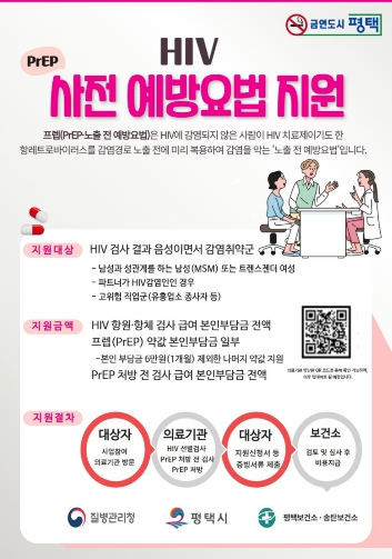 PrEP 지원사업은 전국 17개 시도에서 2025년 1월부터 시행 중이며, 지원 대상 기준 및 신청 절차 등 세부 사항은 평택·송탄보건소 누리집(정보마당'공지사항)에서 확인할 수 있다.