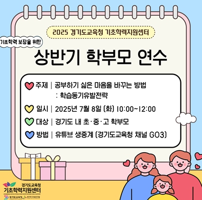 ‘기초학력 보장을 위한 상반기 학부모 연수’와 관련한 세부 내용은 경기도교육청 기초학력지원센터 홈페이지 및 카카오톡 채널과 인스타그램에서 확인할 수 있다.
