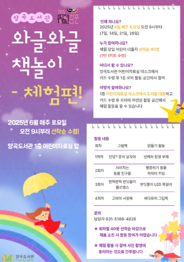 기존 사서가 그림책을 읽어주고 다양한 책놀이 활동을 하는 교육형 프로그램에서 불특정 다수가 자유롭게 참여할 수 있는 체험형 프로그램으로 탈바꿈한 ‘와글와글 책놀이 – 체험편’은 다가오는 6월 매주 토요일 오전 9시부터 당일 어린이 대출자 선착순 40명이 참여할 수 있다.