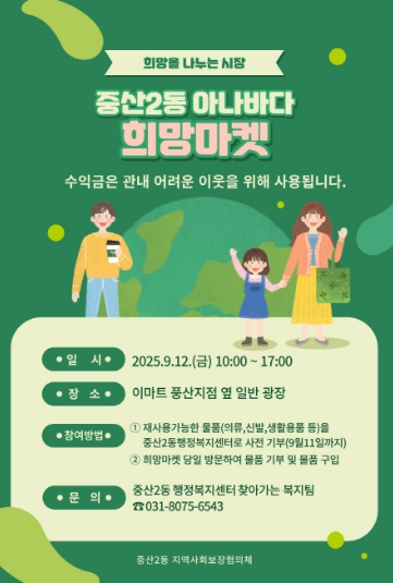 한유희 중산2동장은 “희망마켓은 주민들이 자발적으로 기부하고 함께 나눔에 동참하는 뜻깊은 행사가 될 것”이라며, “희망마켓이 단순한 장터를 넘어 이웃을 돌보는 따뜻한 복지현장으로 자리매김할 수 있도록 준비하겠다”고 말했다.