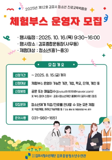 신청 방법은 김포시청소년재단 홈페이지에서 확인할 수 있다. 서류심사를 거쳐 8월 29일 최종 확정 결과를 안내한 후, 운영에 필요한 사항을 계속 협의해 나갈 방침이다.