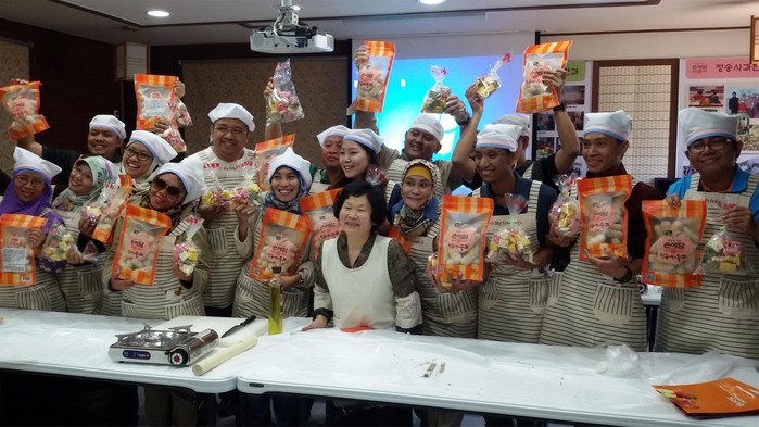 | ▲ 외국인들이 청송사과를 이용해 한과를 만드는 체험을 하고 있다. (사진=경북도 제공) |