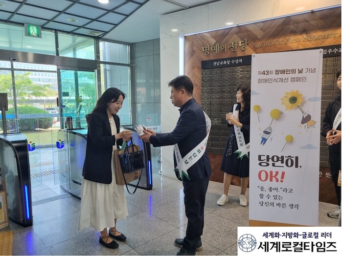 [세계로컬타임즈 김명진 기자] 전라남도교육청은 20일 제43회 장애인의 날을 맞아 ‘함께 길을 찾다, 함께 길을 걷다’라는 주제로 일상적 장애공감 문화 정착을 위한 장애인식개선 캠페인을 실시했다.