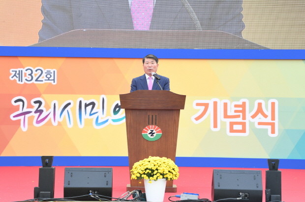 | ▲ 백경현 구리시장이 10일 구리한강시민공원에서 열린 제32회 구리시민의 날 기념식에서 축사를 하고 있다<사진제공=구리시청> |