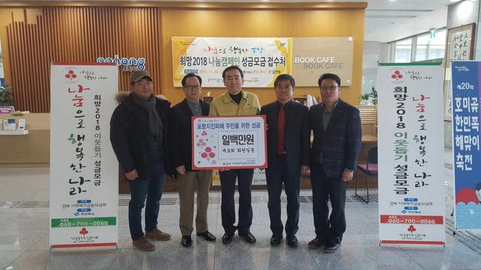 [세계로컬신문 김성욱 조사위원] 세계일보 조사위원 포항시협의회(세포회) 김성욱 회장(왼쪽 두번째)이 지난달 22일 경북사회복지공동모금회를 찾아 포항지진피해 주민을 위해 세포회가 마련한 성금을 전달했다.