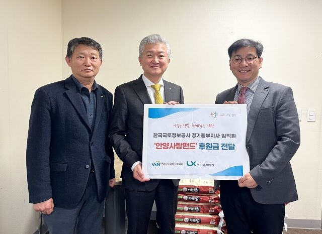 이날 전달된 후원금은 한국국토정보공사 경기중부지사 임직원들이 십시일반 모금한 기부금으로 안양에 거주하는 복지소외계층 발굴 및 위기구호비 지원, 홀몸어르신의 의료지원 등 안양의 지역사회 문제 해결을 위해 모금됐다.