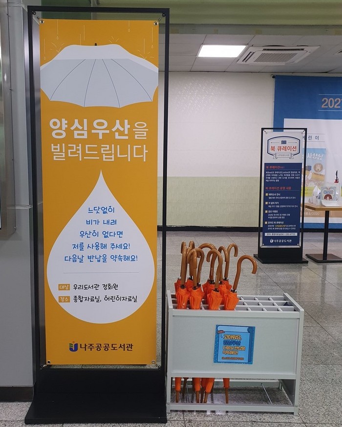 [세계로컬타임즈 강석운 기자] 나주공공도서관(관장 전만석)은 비오는 날 불편을 겪는 지역주민에게 우산을 무료로 대여하는 양심우산 서비스를 지난 17일부터 시작했다.