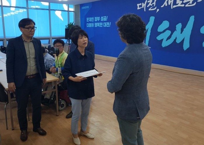 | ▲ 2018대전지방선거장애인연대 관계자들이 5일 오후 허태정 대전시장 후보 사무실을 방문해 '장애등급판정 의혹' 해명할 것을 촉구하는 해명요구서를 허 후보 측 관계자에게 전달하고 있다. <사진제공=2018대전지방선거장애인연대> |