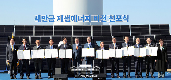 | ▲문재인(가운데) 대통령을 비롯해 박준배(왼쪽 세번째) 김제시장 등이 지난달 30일 새만금 재생에너지 관련 협약서를 들고 포즈를 취하고 있다.(사진출처=청와대) |