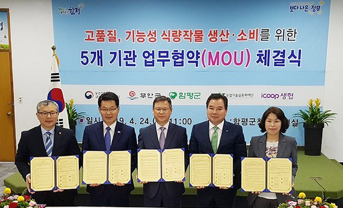| ▲ 24일 함평군청에서 부안군과 국립식량과학원, 농업기술실용화재단, 아이쿱생협사업연합회, 함평군이 고품질·기능성 식량작물 생산·소비를 위한 업무협약을 체결하고 있다.(사진=부안군 제공) |