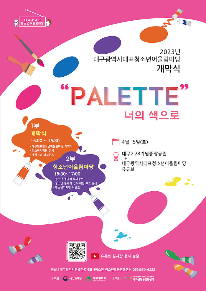 조경선 대구광역시 청년여성교육국장은 “청소년이 청소년 어울림마당을 통해 여가를 즐기고 문화예술 활동을 체험할 수 있길 바란다”며 “앞으로도 건전한 청소년 문화조성을 위한 다양한 정책을 발굴해 지원하겠다”고 말했다.