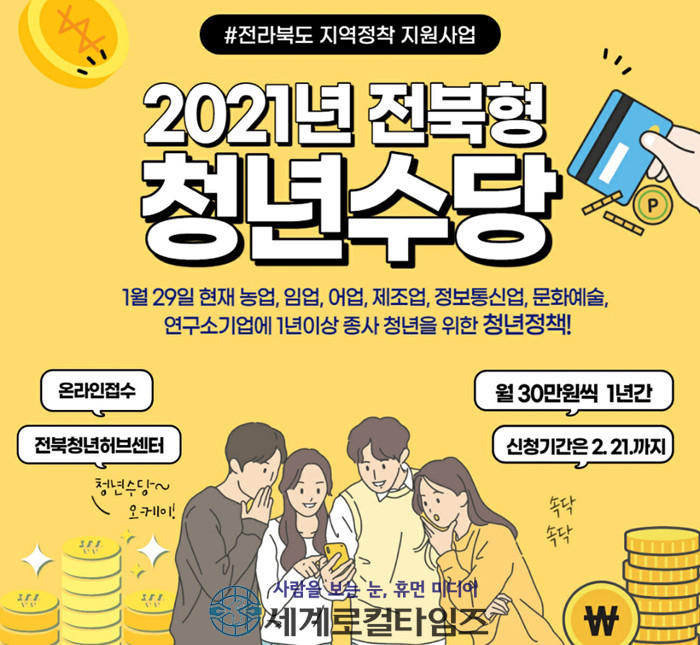 [세계로컬타임즈 조주연 기자] 청년의 경제적 자립과 안정적 정착 지원을 위한 전북청년 지역정착 지원사업이 추진되고 있는 가운데 '2021년 전북형 청년수당' 부안군 참여자를 오는 21일까지 모집한다.