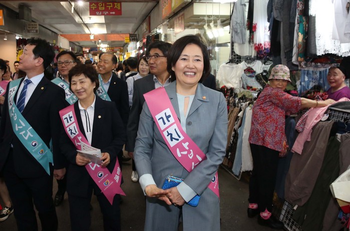 | ▲박영선 중소벤처기업부 장관이 20일 서울 종로구 광장시장에서 가치삽시다 캠페인을 하고 있다. (사진=중소벤처기업부 제공) |