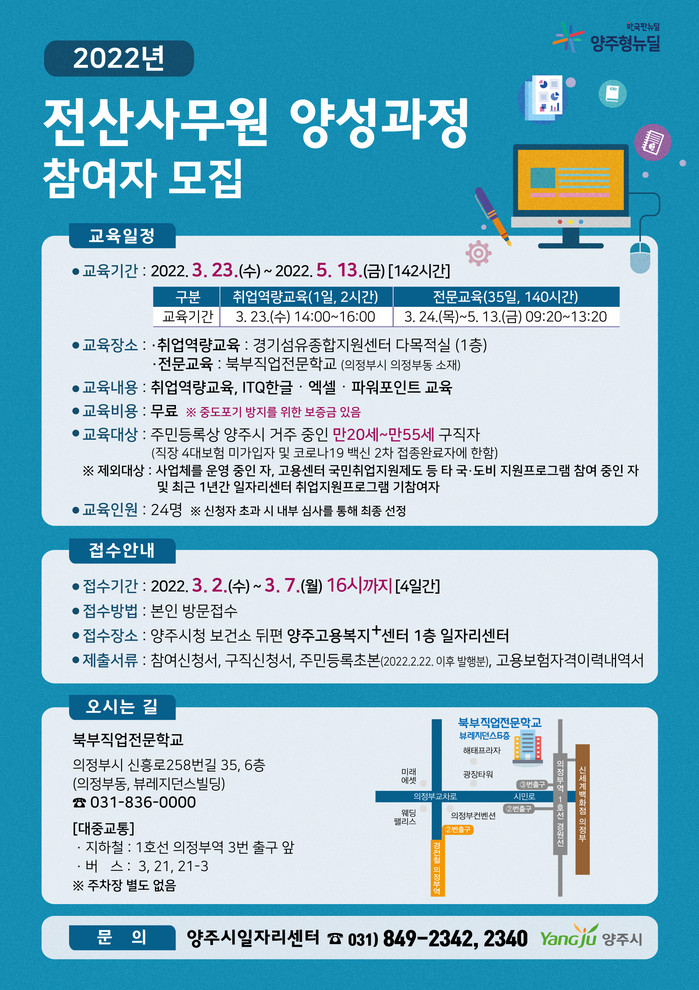 [세계로컬타임즈 한기선 기자] 양주시일자리센터는 오는 3월 2일부터 7일까지 2022년 취업지원프로그램 '전산사무원 양성과정'에 참여할 교육생을 모집한다.
