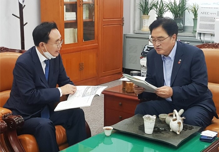 | ▲윤병태 나주시장이 우원식 예결특위원장을 만나 지역 현안사업 국비 추가 반영을 요청하고 있다. (사진=나주시) |