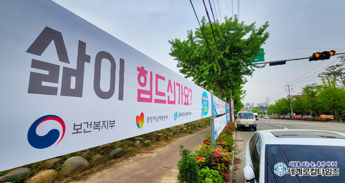 | ▲28일 오후, 김제시청 입구 거리에 극단적 선택을 예방하는 현수막이 걸려 있다. |