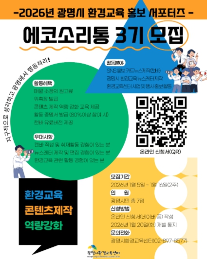 참여 희망자는 1월 16일까지 광명시청 홈페이지(gm.go.kr) 또는 블로그에 게시된 포스터의 큐알(QR)코드를 통해 접수하거나, 신청서를 작성해 이메일로 제출하면 된다.