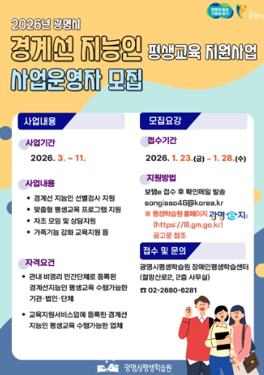접수 기간은 1월 23일부터 1월 28일까지며, 지방보조금관리시스템 ‘보탬이(e)’를 통해 온라인으로 신청할 수 있다. 상세 내용과 신청 서식은 광명시 평생학습원 홈페이지 ‘광명이(e)지’에서 확인할 수 있다.