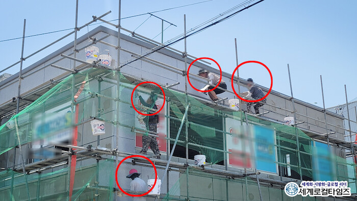 [세계로컬타임즈 글·사진 조주연 기자] 2일 오후, 전북 김제시 서낭당길 도로변 한 건물에서 수명의 노동자가 건물 외벽에 설치한 철재빔에 올라 작업을 펼치고 있다. 그런데 이 중 안전모를 착용한 노동자가 단 한명도 없었고 안전줄도 매지 않았다.