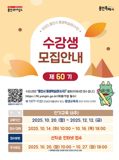 접수는 14일부터 16일까지 용인시 평생학습관 홈페이지에서 선착순으로 받는다.