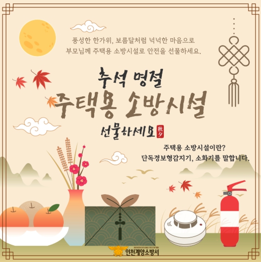 송태철 서장은 “주택용 소방시설은 대형 화재를 막을 수 있는 가장 효과적인 초기 수단”이라며 “이번 추석 명절에 고향에 계시는 부모님께 주택용 소방시설이라는 안전을 선물해 뜻깊은 연휴를 보내시기 바란다”고 말했다.