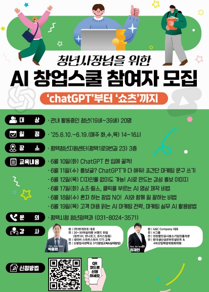 참가 대상은 평택시 관내에서 활발하게 활동 중인 만 19세부터 39세까지의 청년 사업가이며, 신청은 안내 이미지의 정보무늬(QR코드)를 통해 가능하다.