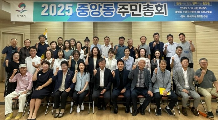 이날 주민총회에서는 정장선 평택시장과 중앙동 주민 100여 명이 참석해 중앙동 주민자치프로그램 팀(고고장구, 라인댄스) 공연을 즐기고 2026년에 추진할 마을사업 계획을 함께 공유하는 뜻깊은 시간을 보냈다.