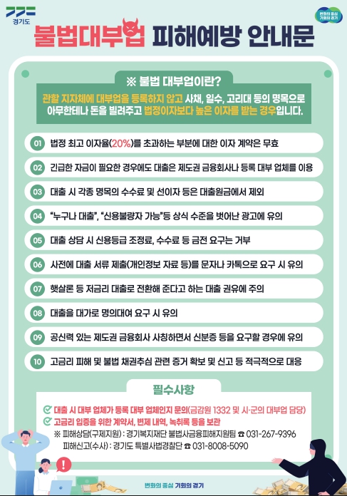 기이도 경기도 특별사법경찰단장은 “온라인 커뮤니티나 누리소통망(SNS)을 통한 불법 대출 유혹은 심각한 사회 문제로 이어질 수 있는 만큼 이번 캠페인을 통해 사금융에 대한 인식을 개선하고, 청년층의 대응력을 높여 선제적으로 피해를 차단하겠다”며 “사례 중심 교육과 맞춤형 홍보를 통해 도민의 금융안전을 지키고, 피해 발생 시 고강도 집중수사와 피해자 구제로 ‘선(先)예방, 후(後)지원’ 체계 확립에 앞장서겠다”고 말했다.